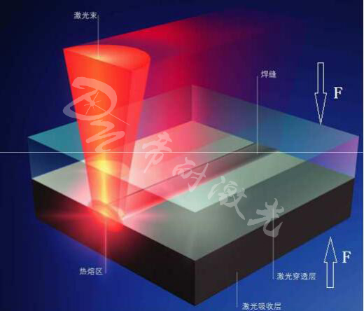 塑料激光焊接原理:通過壓力將兩個待焊接塑料零部件結合在一起,將一束紅外激光定位于待粘結部位,激光束透過上層透光材料,被下層材料吸收,吸收的激光能量轉換成熱能,由于兩層材料被壓在一起,熱能從吸收層傳導到透光層上,使得兩層材料熔化并結合。同時由于材料本身的熱膨脹擴張產生內部壓力,內部壓力與外部壓力共同作用確保了兩部分的堅固焊接。對于產品本身是不吸光的下層材料,需要添加吸收劑進行處理。